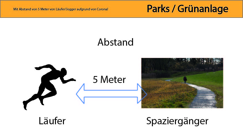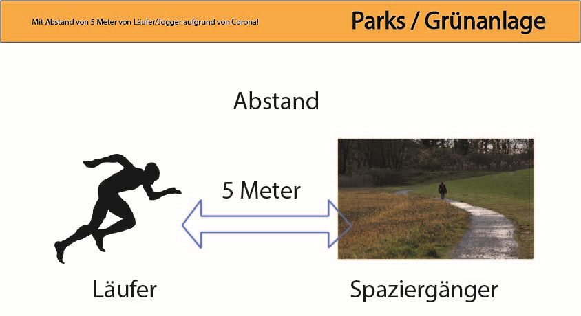 Abstand von 5 Meter im Umkreis von Jogger/Läufer, d. h. zwischen Spaziergänger und Läufer/Jogger mit Abstand von 4 Meter im Parks, Grünanlagen, Fußweg (bebaute Gebäude oder z.B. Autobahn-Tunneldeckel) zu halten! Vorsicht vor Corona-Ansteckung auf Läufer/Jogger!